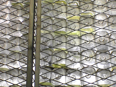 建築現場の足場フレームとペットボトルなどを使ってで造られた建物は、